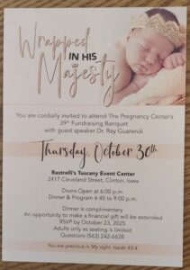 We have so much to celebrate as our God has answered so many prayers in overturning Roe vs Wade and now the Heartbeat Bill is the law of the land in Iowa! Praise God! If you can join us please call 563-242-6628 to reserve your seat. Our fundraiser goal is $60,000 and we are counting on you! To give your tax-deductible gift simply mail in your check or donate here: